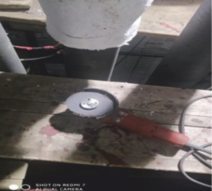 Монтажник проводил огневые работы на полу по резке стального тавра с применением углошлифовальной машины (УШМ). Произошло зажатие круга в месте реза, и УШМ вырвалась из рук работника, попав в область подбородка.